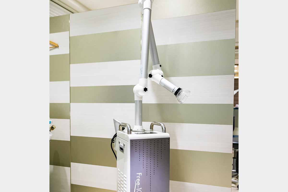 治療中に飛び散った唾液や、歯や詰め物・被せ物などの修復物を削った粉塵を瞬時に吸い込む機械です。診療室内を清潔に保ち、院内感染のリスクを低減することができます。